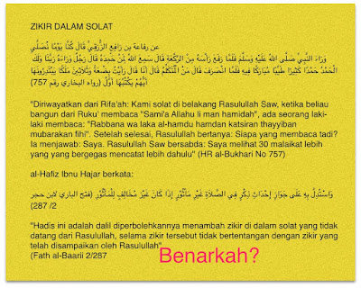 3. Bagi mereka yang mengaji pengajian hadith secara khusus, mereka maklum bahawa suasana yang ada dalam hadith ini TIDAK membenarkan terjemahan dan tafsiran bahawa ia menjadi dalil kepada bolehnya menambah zikir dalam solat, sebab :